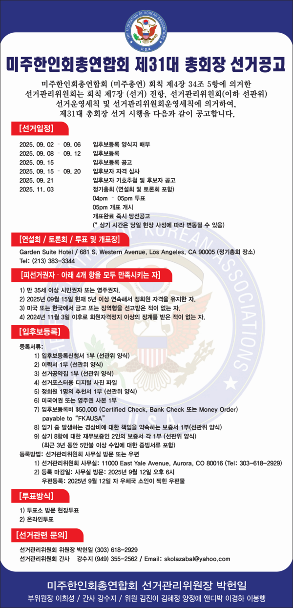 한편, 미주총연 선거관리위원회(위원장 박헌일)는 오는 11월3일 제31대 총회장 선거를 앞두고, 최근 선거공고를 통해 9월8일 부터 12일까지 입후보 등록 신청을 받는다고 밝혔다.