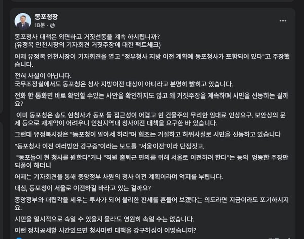 김경협 재외동포청장이 29일 오후 유정복 시장의 전날 기자회견 내용을 두고 자신의 페이스북에 올린 반박 글. “정부 차원 이전 추진 없다”…재외동포청 공식 반박