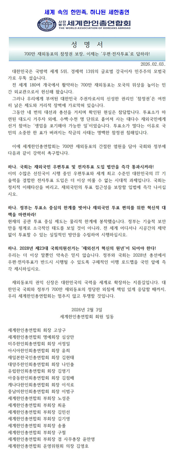세한총연은 성명서를 통해 '재외국민 선거는 2012년부터 시행돼 그간 여러 차례 대선·총선을 치렀으나 아무것도 바뀐 것이 없었다'며 정부와 국회는 28년 23대 국회의원 선거에서 부터는 반드시 '우편·전자 투표 도입하는 입법'과 '혁신적 대책 로드맵'을 즉각 실행할 것을 축구하였다.